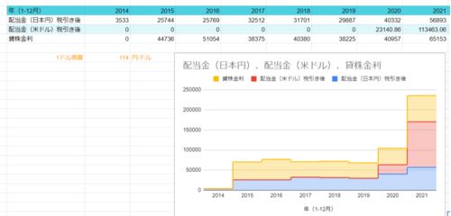 さて、「FIRE」とかいう言葉が流行った2021年でした。まぁこのままだとアーリーリタイアはとても遠いなぁ……。 一応どの程度遠いのか、現在の配当金確認を。 日本株配当(および、2014-2021前半は投資信託が「受け取り型」設定だった分)、2020年から始めた米…